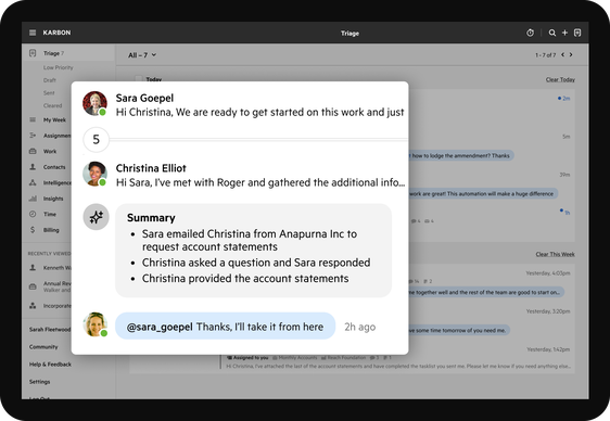 Turn extended email threads and internal discussions into bite-sized, actionable summaries with Karbon AI. Quickly identify the essentials, deciding if a more in-depth look is needed.