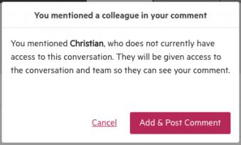 Now, if you mention a colleague in a comment that is related to a private contact or one of their work items, you will be required to add that colleague to the related client team or work team (if they aren't already part of it). A message will appear before you post the comment, just to let you know that this is happening.