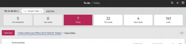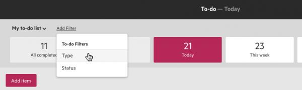 This is why we have introduced filters to your To-do list. You can now turn off certain types of items, ensuring that what you view is a true representation of what you need to work on. At the top of your list, you can choose to only view certain types of to-do items (work, email, notes, tasks), and/or items in chosen status/es.