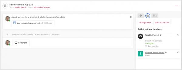 We've made it easier to add an existing note to the timeline of a contact or work item. Just like you can with an email, you can now change a note's work item, add it to another contact, or remove it from a timeline altogether, all from the note's information panel.