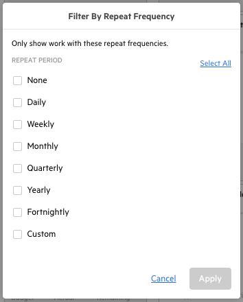 A new filter for Repeat Frequency allows you to view work items that repeat by certain frequencies.