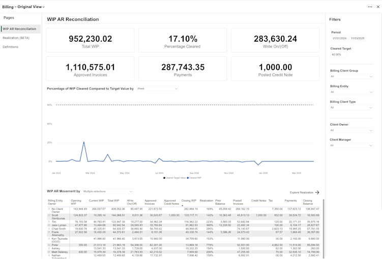The WIP AR Reconciliation report provides daily updates on your firm’s key WIP and AR metrics like total WIP, payments received, and total posted credit notes within your selected time period.