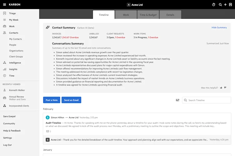At the top of your contact timeline, Karbon AI will automatically generate a comprehensive overview about your client including amount invoiced, unbilled, client requests, and work items. It’ll create a bulleted summary of the latest 10 email and note conversations.