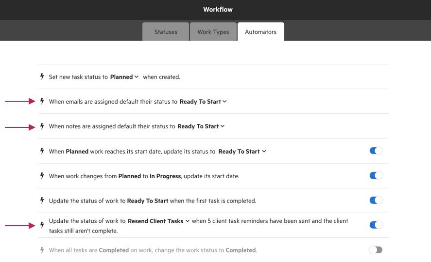 Global Automators allow you to adjust settings that update your workflows, tasks and work statuses automatically. Three new Global Automators have been added to give you more control: