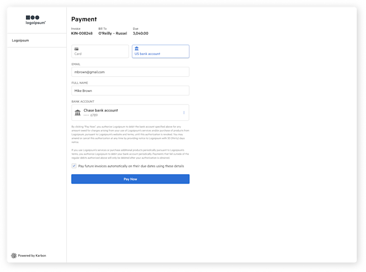 When you issue invoices to your clients, they can securely connect their bank account and save their payment details for automatic future payments.