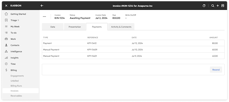 A new Payments tab has been added to invoices in Karbon Billing to help you track payment activities on any given invoice more easily.