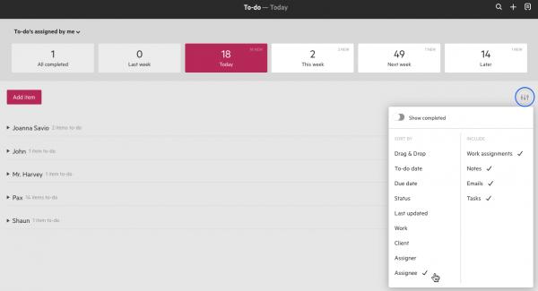 On your To-do page, you can now view all to-do items that you have assigned to others. Sorting this view by assignee will break the list into a section for each colleague. This makes it easier to keep track of all tasks that are still outstanding for each member of the team that you have assigned items to.