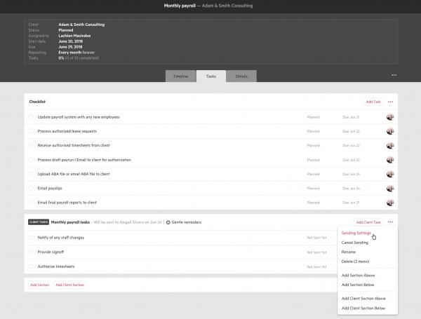 Some visual changes have been made to the task list on work items to make everything cleaner and easier-to-navigate. Client tasks now have their own section/s, which you can rename at any time. The section title will be seen by your clients too, which is useful if you want to break their tasks into smaller bites. As part of this change, any of your existing client tasks have been automatically moved to their own section.