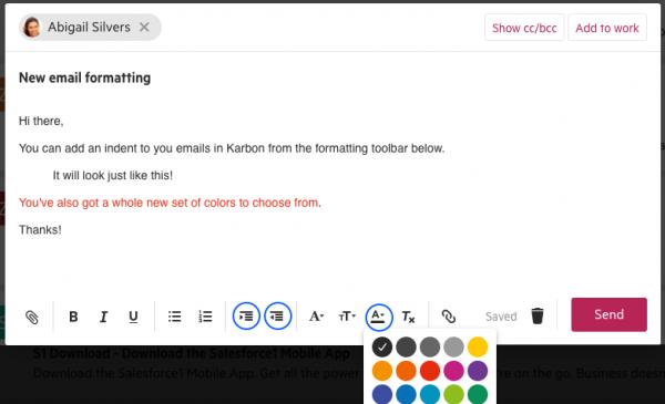 We have updated the formatting again. You can now add indentation to your emails or notes, and you have a new colour palette to choose from.
