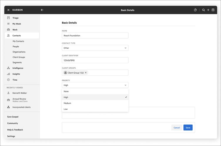 Some clients need extra attention, and now you can make that crystal clear in Karbon. Assign priority levels to your contacts and filter your contact list accordingly, so you can always focus on high-value clients and make informed decisions based on priority.
