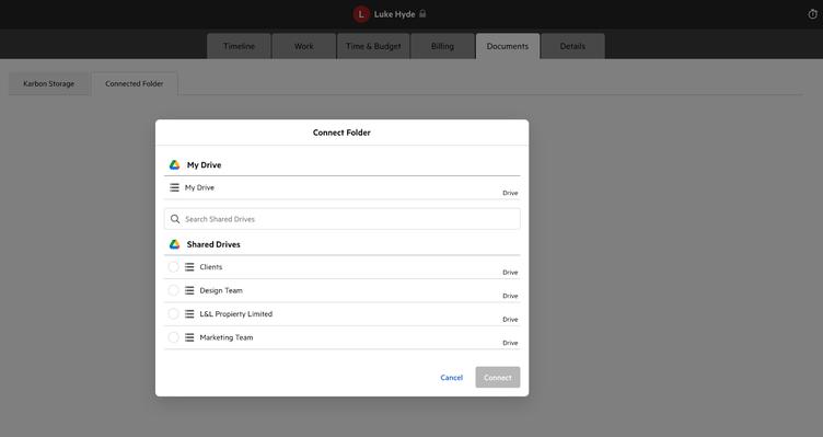 • Auto-copy: Files in Karbon Storage automatically sync to connected Google Drive folders on work items.
