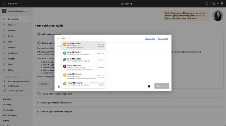 Finding and choosing the right person to email is now easier and more intelligent in Karbon.