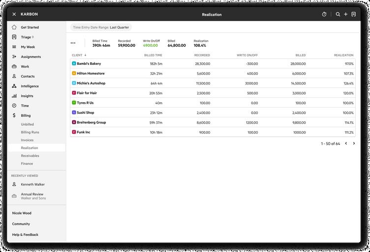 Karbon Billing now automatically calculates your realization rate for fixed fee and recurring work, so you can focus on making decisions rather than manually compiling data.