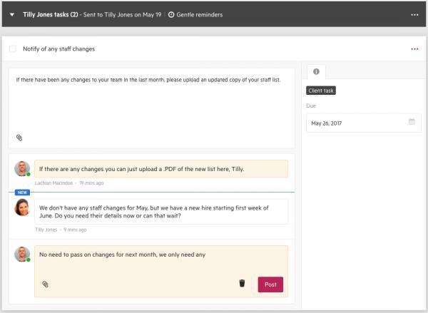 You can now discuss tasks with your client by commenting directly on the task in question. Your client will see your comments instantly in their own view of the tasks and can respond with questions or comments of their own.