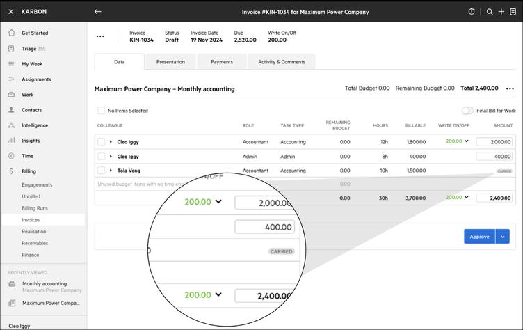 We’ve made it easier to manage time and expenses added to work items after an invoice is drafted. Now, any new time or expenses will automatically appear in a ‘carried’ state, allowing you to easily track them without immediately including them in the current invoice. This change gives you the flexibility to decide whether to include these items while ensuring that they are deferred by default, giving you greater control and accuracy over your billing process.