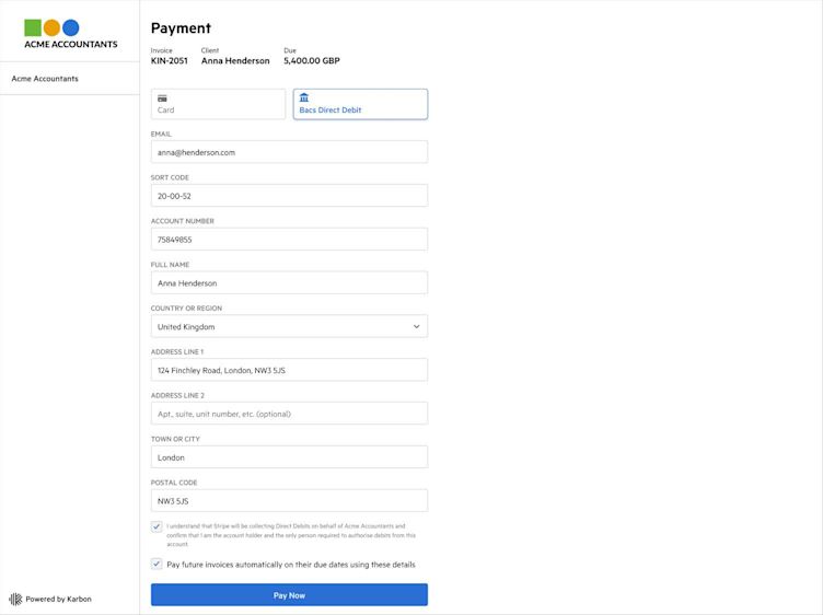 Clients can enter their bank account information to pay an invoice using direct debit. An option is given to save payment details for automatic payment of future invoices. Make collecting future payments even faster by using the new Request Payment Details feature to collect direct debit payment details in advance of work being done.