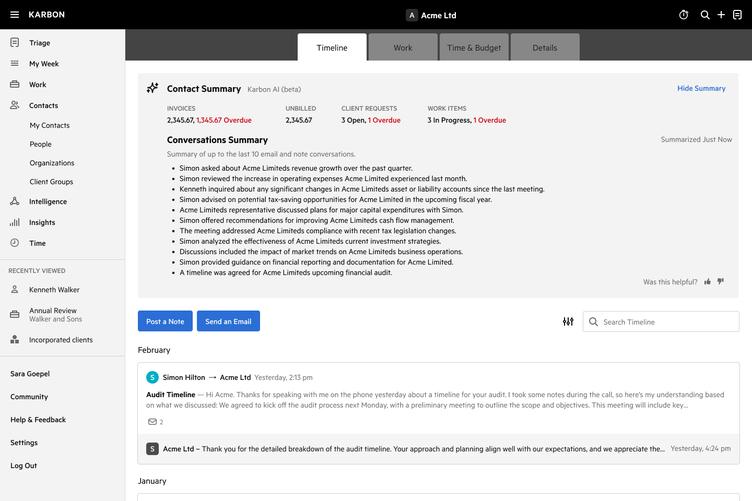 Use Karbon AI to instantly get up-to-speed on your team’s latest interactions and activity with a client.