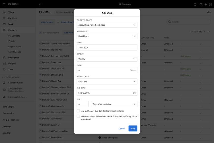 In addition to reassigning work in bulk, you have the option to create new work in bulk. Now, when you schedule multiple work items to repeat, you can choose an end date rather than having them repeat indefinitely.