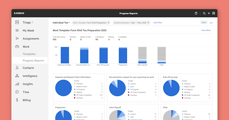 Now in beta, progress reports give you a clear, real-time view of how tax work is progressing across every stage of the season. Available in a new tab under Work, these reports let you see progress across sections, filter by work type, template, client, client type, and client group—so you can quickly understand how work is actually progressing.