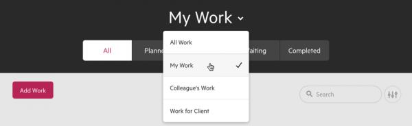 Updated Work list filters We’ve updated the Work overview by moving the ability to filter by All Work, My Work, Colleague’s work, and by Work status into the header.