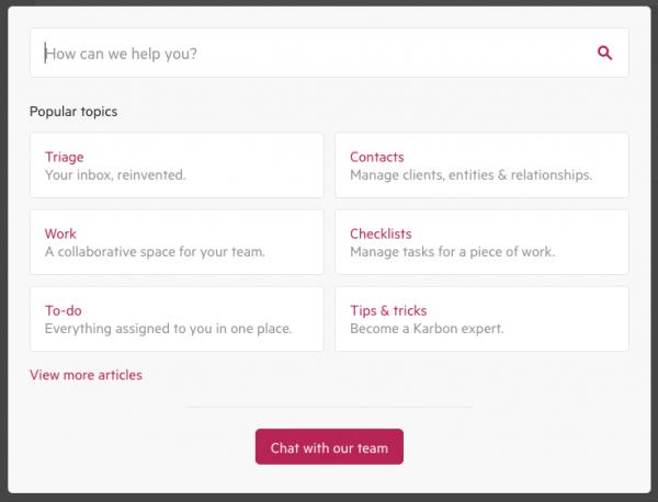 Help and Feedback content You’ll see when clicking on the Help & Feedback link that we’ve introduced links and a search to access support content. The Karbon team is still available to answer questions by clicking the “Chat with our team” button.