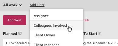 Based on your feedback, we have added a new filter for "Colleagues Involved". Applying this filter will only show work items that the colleagues you select (or teams of colleagues) are involved in. For this filter, "involvement" means anyone on the work team (assigned tasks, emails and notes related to the work or assigned the work itself).