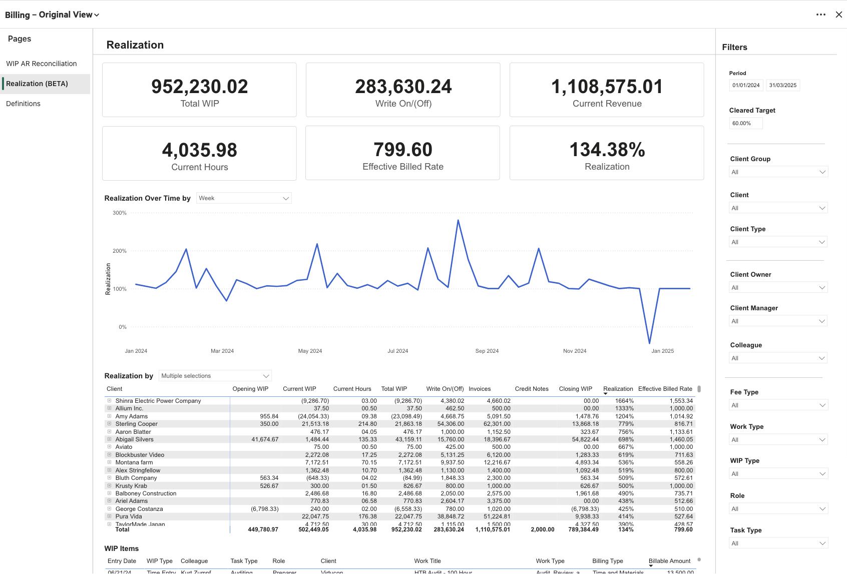In the Realization report, you can look at all data available in the WIP AR Reconciliation report in much greater detail. Slicing your data up by work, team members, role and task type to better understand where your WIP is and how it’s being billed.