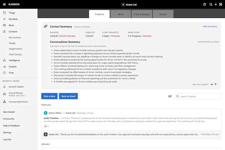 At the top of your contact timeline, Karbon AI will automatically generate a comprehensive overview about your client including amount invoiced, unbilled, client requests, and work items. It’ll create a bulleted summary of the latest 10 email and note conversations.