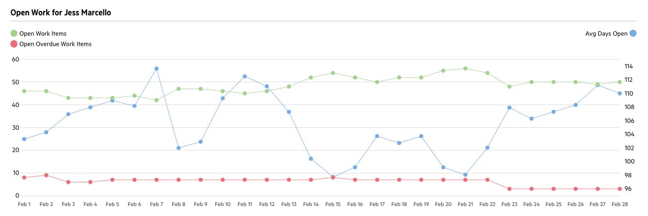 When you click a colleague's name, you can view their open work, completed work and overdue work over your specified time.