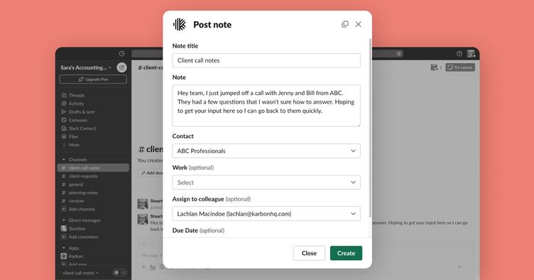 You can now take any post from Slack and add it as a note on a Karbon timeline. You also have the option to assign the note to a colleague and add a due date.