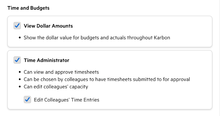 We have added extra permissions in settings for time admins to edit and submit a colleague’s timesheet entries in cases where the user can’t do this themselves.