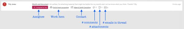 In Karbon, there are a lot of extra details that can be associated with an email thread. As well as attached files and multiple emails in the thread, it can also have internal comments, an assignee, and an associated work item and contact.
