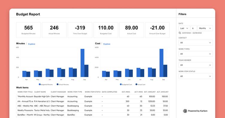 Use filters for work types, team members, and work item status directly in Karbon to explore detailed information and understand which clients are over (or close to going over) budget.