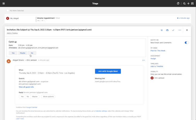 Connecting your calendar in Karbon will ensure you can respond to meeting invites directly via Triage. Responding with your preference to the meeting or event will automatically be added to your calendar. You can change your response at any time by clicking on the calendar event in My Week.