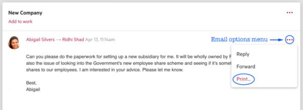 Printing emails You’ll be able to print emails, simply by searching for the email, opening it, clicking on the email’s options menu (...), and selecting print.