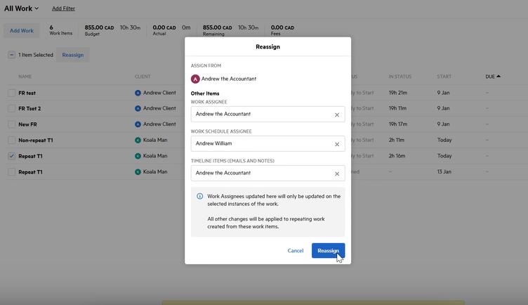 You can now update the assignee for multiple repeating work items in bulk with the flexibility to decide whether to reassign individual items or the entire schedule.