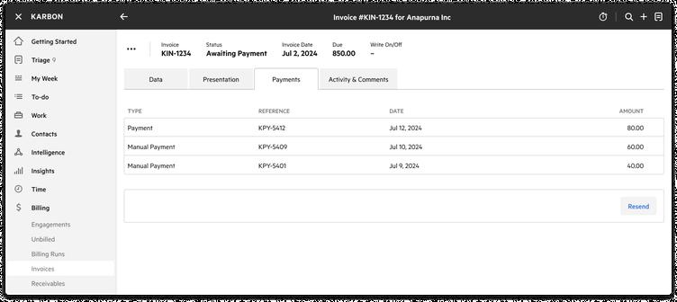 A new Payments tab has been added to invoices in Karbon Billing to help you track payment activities on any given invoice more easily.