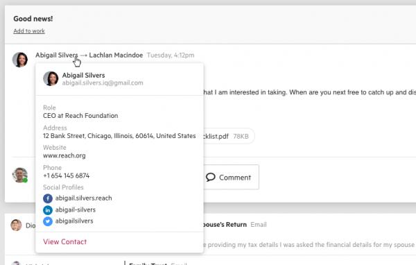 When you're reading an email, you can now see the most important details of the sender at-a-glance. Just click on the sender to display a hovercard showing fields such as role, company, address, phone number, social profiles and more.