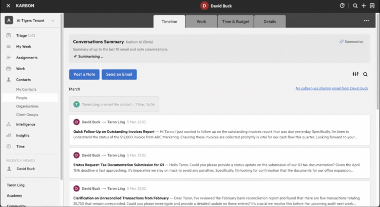 In April, Karbon AI added the ability to generate a summary of the latest 10 emails and notes on client timelines to help you and your team get up-to-speed on client activity.