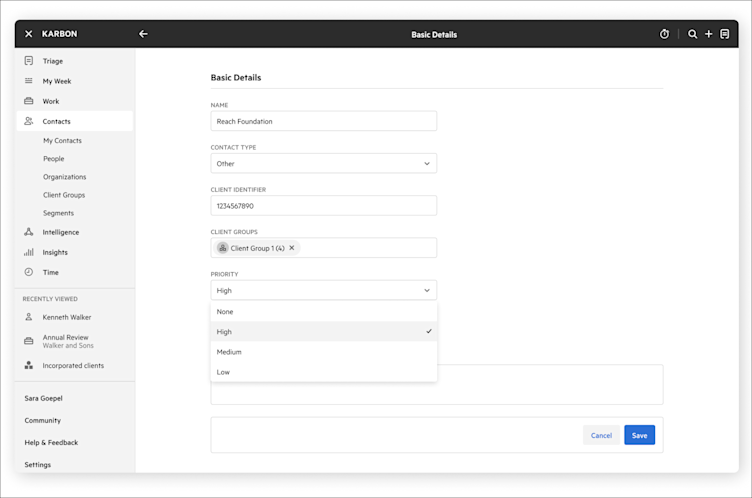 Some clients need extra attention, and now you can make that crystal clear in Karbon. Assign priority levels to your contacts and filter your contact list accordingly, so you can always focus on high-value clients and make informed decisions based on priority.
