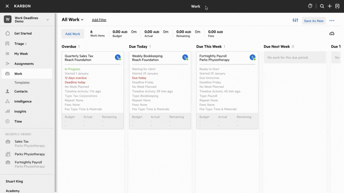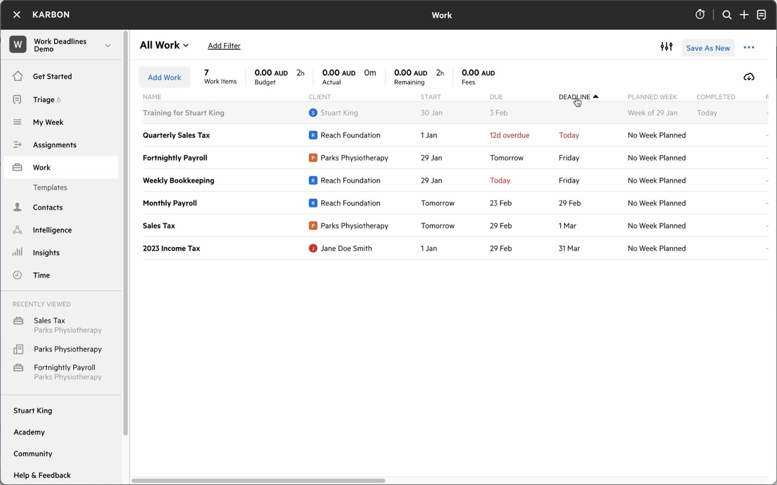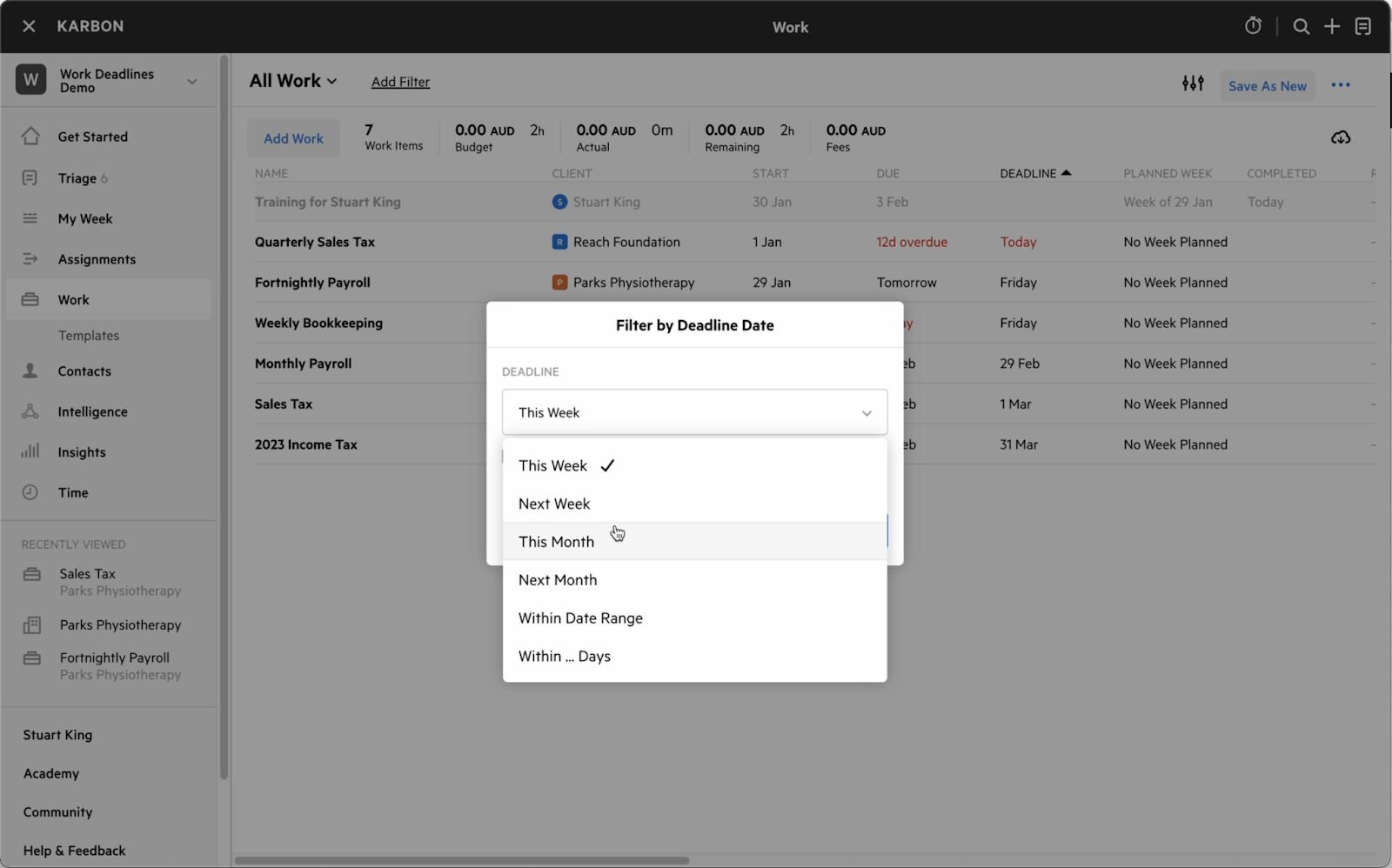 Karbon’s deadline feature gives your firm the ability to add external deadline dates to work items and manage work based on those.