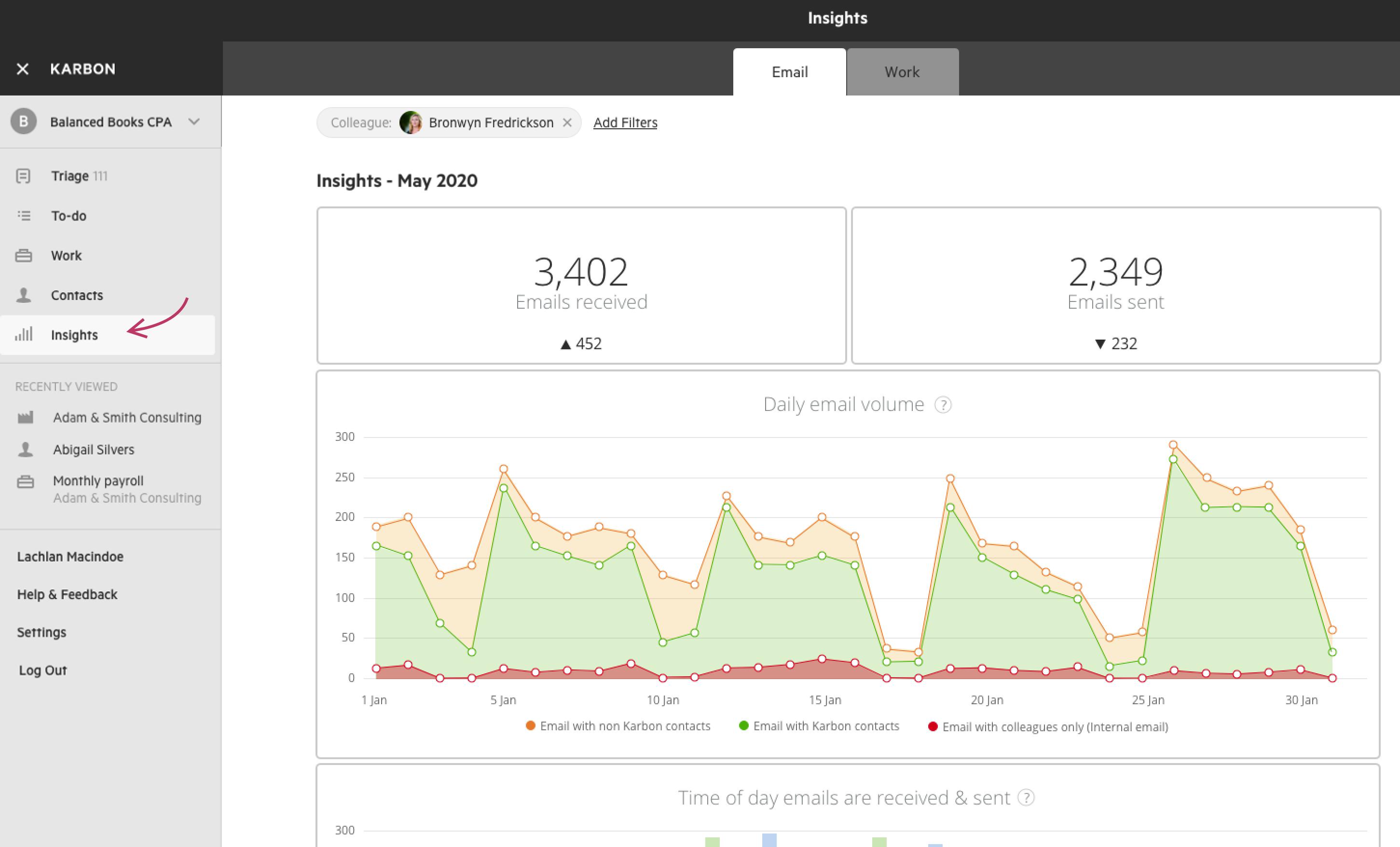 Daily email volume across your firm, or for specific clients or employees