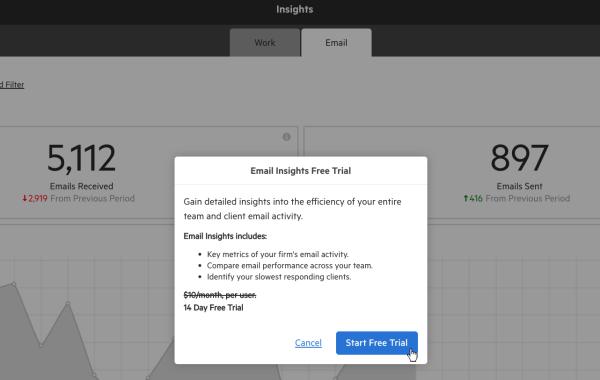 To activate your free trial, or to upgrade to this paid add-on, simply navigate to Insights from your main menu and open the Email tab. You will then have the option to start your free trial. Once your trial is activated, it will be turned on for your entire firm.