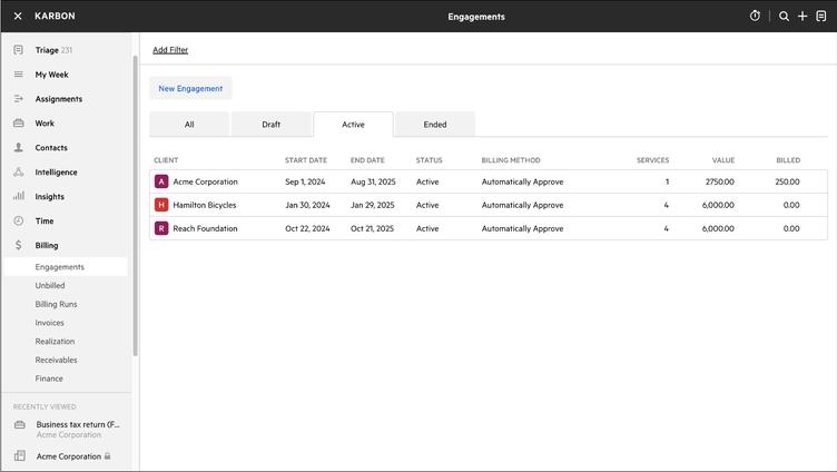 You can now quickly filter and organize your engagements on the Billing > Engagements screen with helpful list filters for client, client group, client manager, and client owner. Toggle between the new status tabs for separate views of drafted, active, or ended engagements.