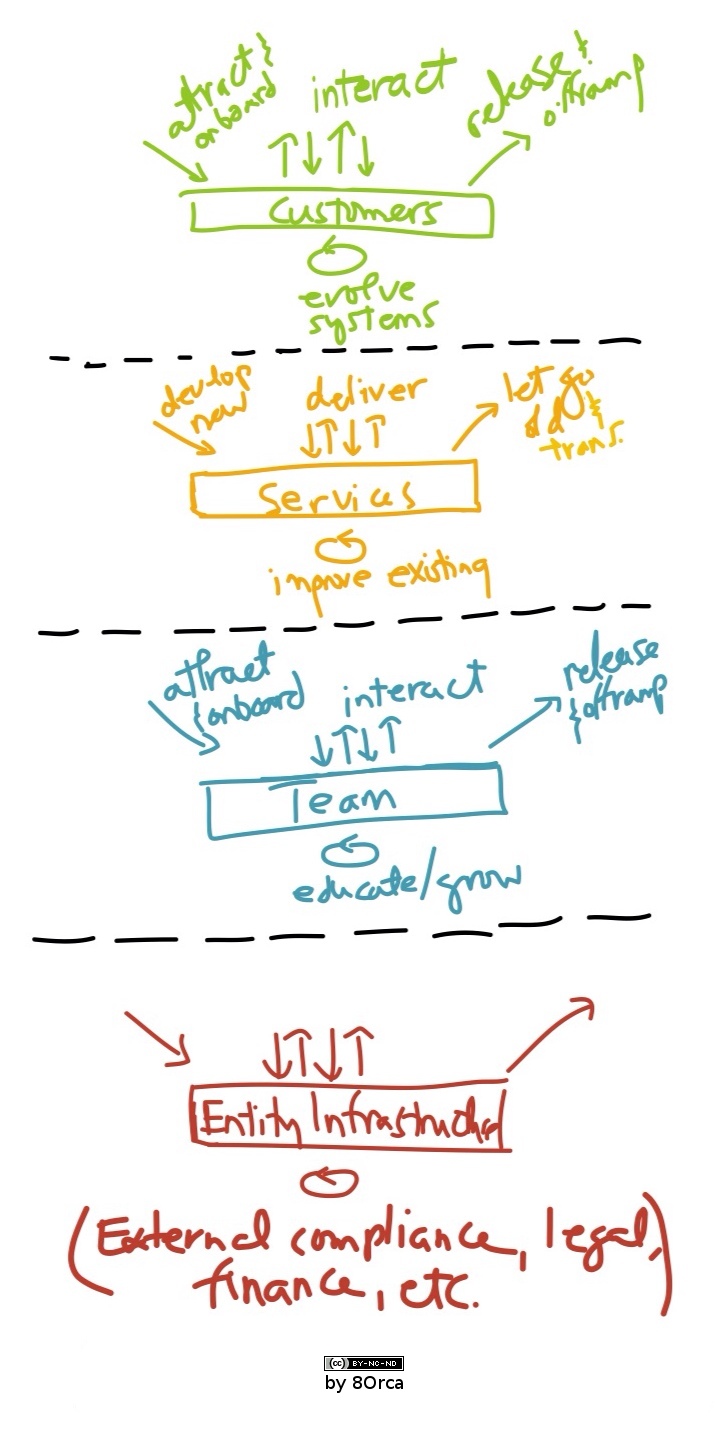 For example, for the Customers element I have Attract & onboard, Interact, Release & offramp, and Improve components. Attract & onboard is where we list items such as: