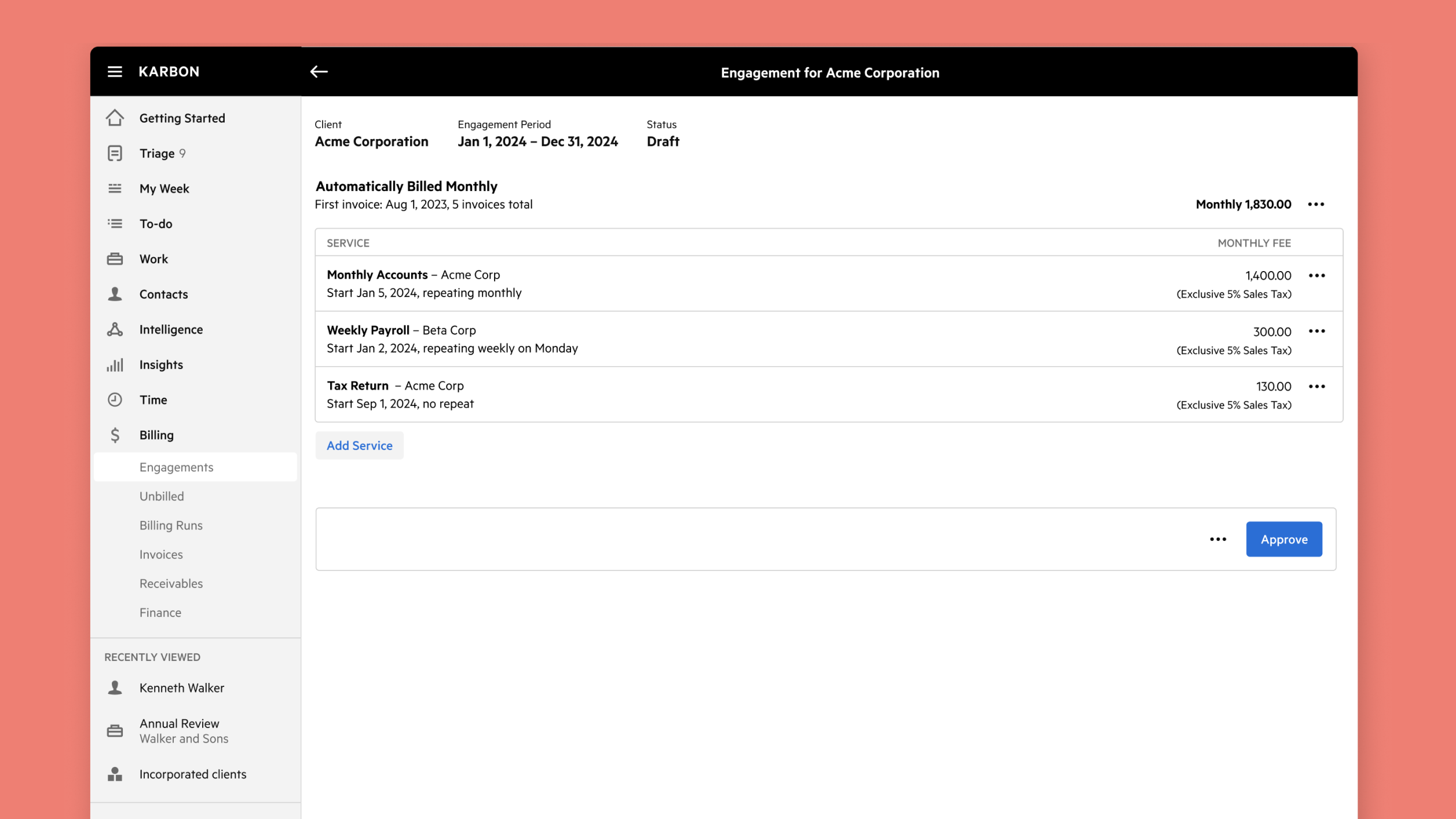 Engagements view in Karbon’s Billing section shows recurring billing for ‘Accounts’ and ‘Payroll’ for Acme Corporation