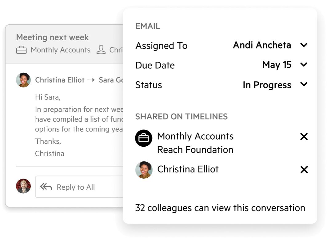 Every email, internal note and detail, for each client, is in one shared place for your team. Know who last contacted a client, what was said, and when that was.